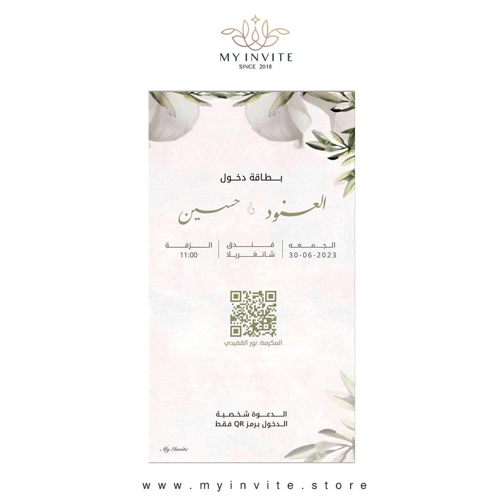نموذج بطاقة دخول زفاف​ الكترونية من ماي إنڤايت يجمع بين الأناقة والبساطة في آنٍ واحد، ويعكس رُقي المناسبة دون مبالغة.